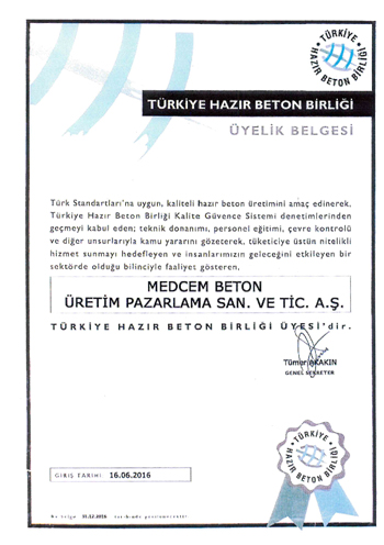 MEMBERSHIP CERTIFICATE OF TURKISH READY CONCRETE ASSOCIATION